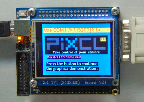 For a more comprehensive demonstration, see the USB HID Graphics Demo that configures the board as a USB Human Interface Device. PiXCL 11 includes a comprehensive set of commands to write graphics objects and text to the LCD.