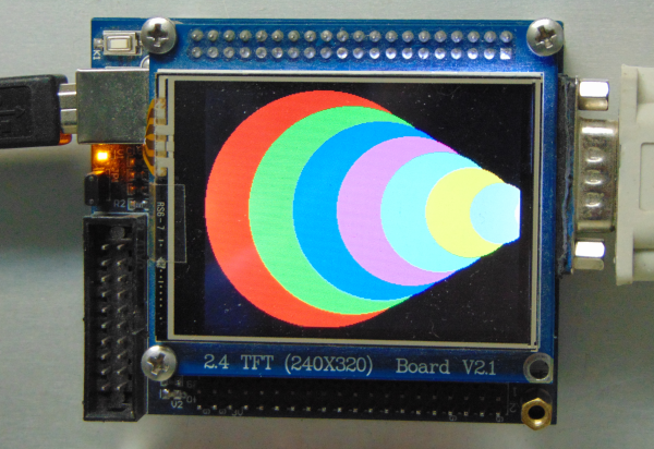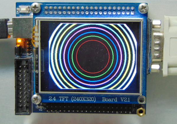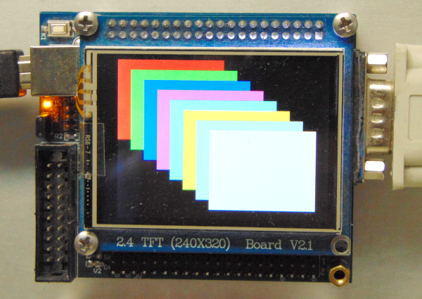 This firmware demo is a simple test of the graphic test pattern commands in the firmware. The board does not appear as a USB device. When the board is power up, this display below appears. You can connect a terminal app window to the COM port if desired.
